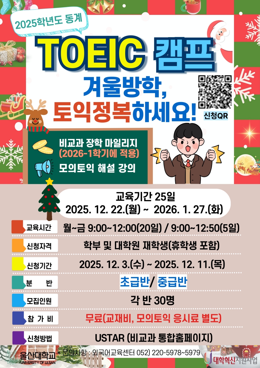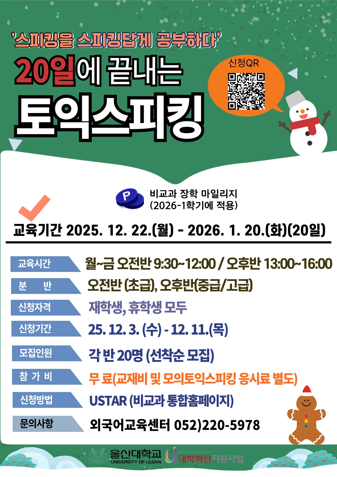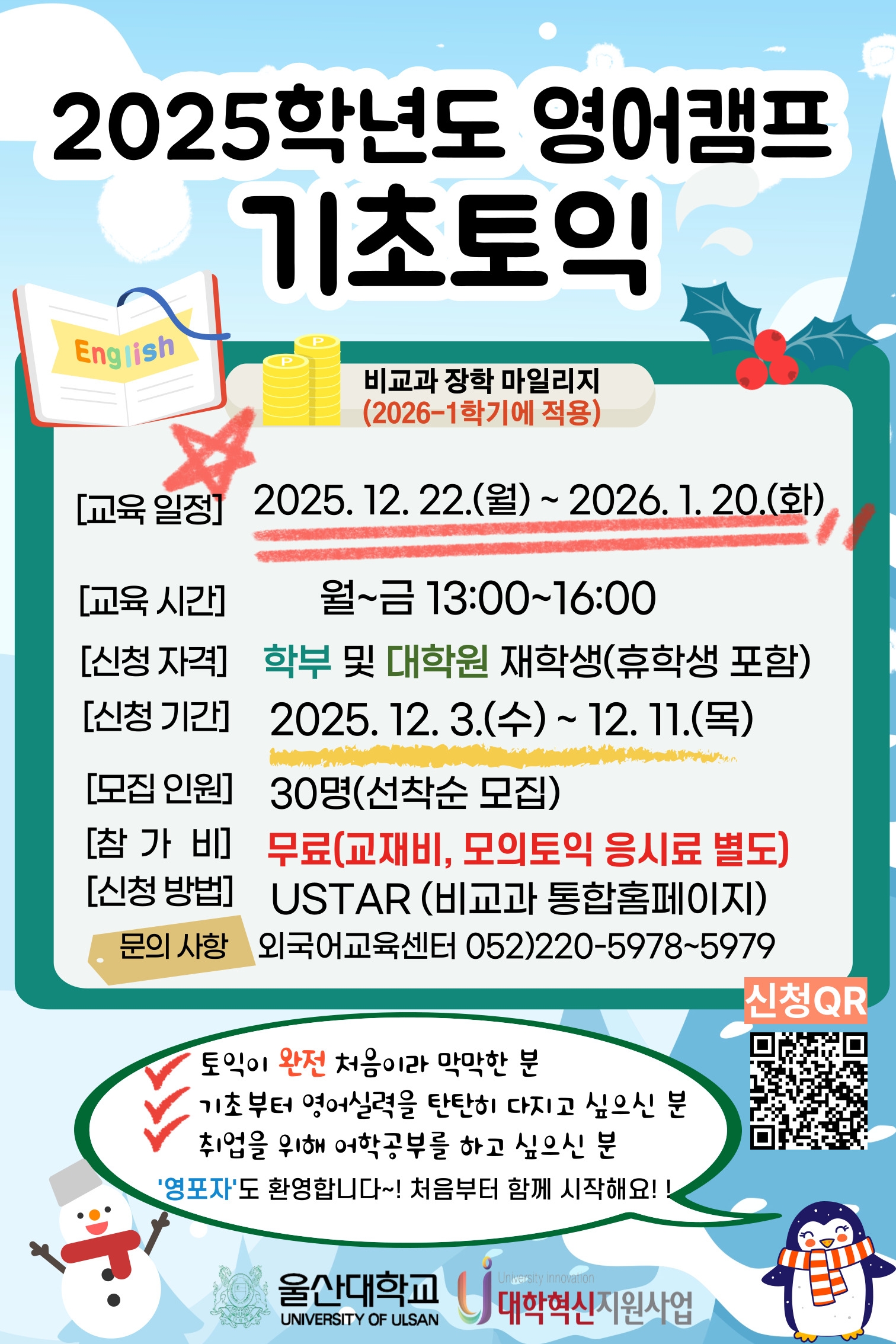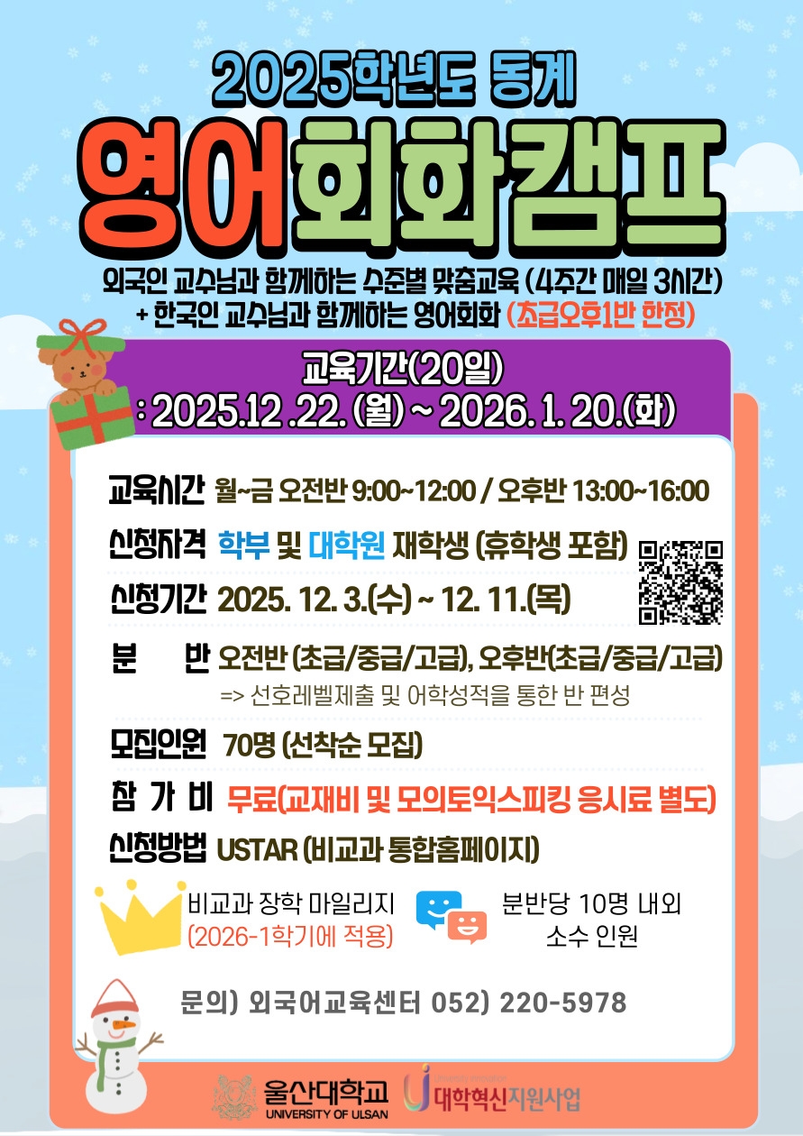 1. 프로그램 : 2025학년도 동계 영어캠프 2. 모집인원 : 총 220명 (영어회화 70명, 토익스피킹 60명, 기초토익 30명, 토익 60명) 3. 신청자격 : 본교 학부 및 대학원 재학생(휴학생 포함) 4. 교육기간 가. 영어회화, 토익스피킹, 영문법 : 2025. 12. 22.(월) ~ 2026. 1. 20.(화) 나. 토익 : 2025. 12. 22.(월) ~ 2026. 1. 27.(화) 5. 신청기간 : 2025. 12. 3.(수) 09:00 ~ 2025. 12. 11.(목) 23:45까지 6. 신청경로 : 울산대학교 비교과통합홈페이지(USTAR) 7. 참가비 : 무료(교재비, 모의토익 및 모의토익스피킹 응시료 별도)